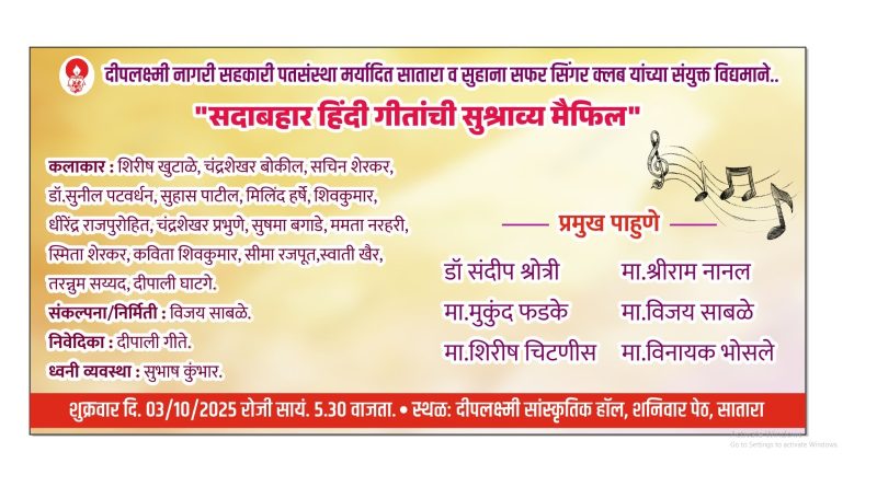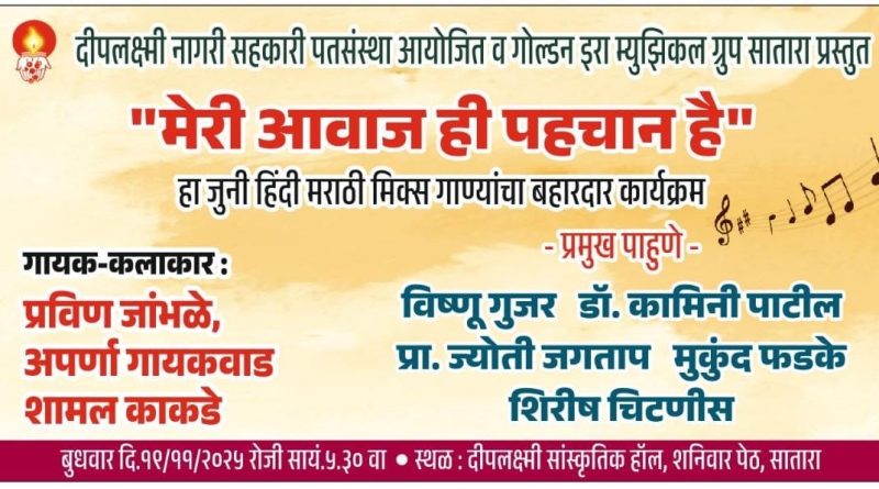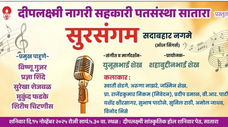 सातारा येथील दीपलक्ष्मी नागरी सहकारी पतसंस्थेतर्फे सुरसंगम सदाबहार नगमे हा गाण्यांचा कार्यक्रम शनिवार दिनांक 15 नोव्हेंबर रोजी सायंकाळी 5:30 वाजता