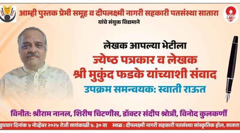 बुधवारी लेखक मुकुंद फडके यांच्याशी संवाद आम्ही पुस्तकप्रेमी समूह व दीपलक्ष्मी पतसंस्थेतर्फे आयोजन सातारा येथील आम्ही पुस्तकप्रेमी समूह व दीपलक्ष्मी