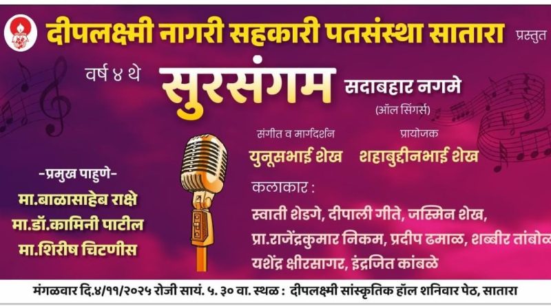 सातारा येथील दीपलक्ष्मी नागरी सहकारी पतसंस्थेतर्फे सुरसंगम सदाबहार नगमे हा गाण्यांचा कार्यक्रम मंगळवार दिनांक 4 नोव्हेंबर रोजी सायंकाळी 5:30 वाजता