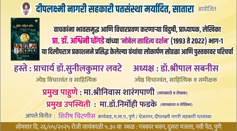 येथील दीपलक्ष्मी नागरी सहकारी पतसंस्थेतर्फे ज्येष्ठ लेखिका प्राध्यापक डॉक्टर अश्विनी धोंगडे यांनी लिहिलेल्या नोबेल साहित्य दर्शन भाग एक या दिलीपराज प्रकाशनने प्रसिद्ध केलेल्या ग्रंथाचा लोकार्पण सोहळा आणि पुस्तकावर परिचर्चा असा कार्यक्रम सोमवार दिनांक 26 मे रोजी सायंकाळी साडेपाच वाजता पत्रकार भवन नवी पेठ पुणे येथे होणार आहे