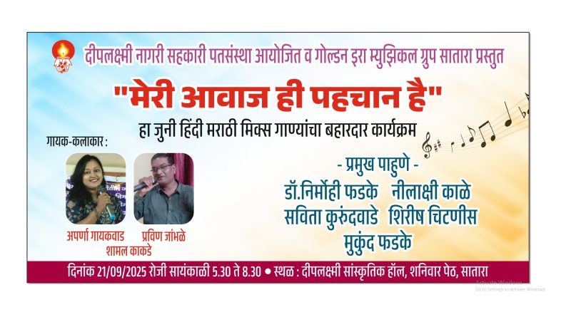 येथील दीपलक्ष्मी नागरी सहकारी पतसंस्था आणि गोल्डन इरा म्युझिकल ग्रुप सातारा यांच्या संयुक्त विद्यमाने मेरी आवाजही पहचान है हा जुना हिंदी मराठी मिक्स गाण्यांचा बहारदार कार्यक्रम रविवार दिनांक 21 सप्टेंबर रोजी सायंकाळी साडेपाच वाजता दीपलक्ष्मी सांस्कृतिक हॉल येथे सादर केला जाणार आहे
