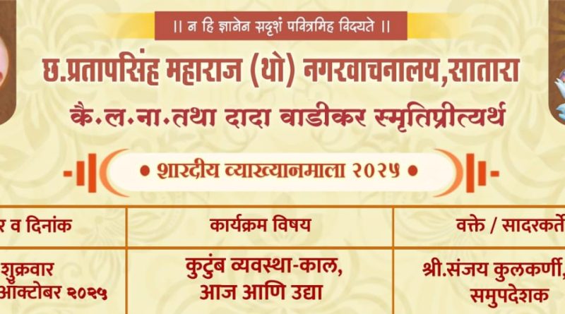 येथील छत्रपती प्रतापसिंग महाराज थोरले नगर वाचनालयातर्फे ल. ना. तथा दादा वाडीकर स्मृती प्रित्यर्थ शारदीय व्याख्यानमालेचे आयोजन करण्यात आले असून त्याचा प्रारंभ शुक्रवार दिनांक 3 ऑक्टोबर रोजी होणार आहे. पाच दिवस चाललेली चालणारी ही व्याख्यानमाला पाठक हॉलमध्ये होणार असून दररोज संध्याकाळी ६ वाजता व्याख्यान होणार आहे