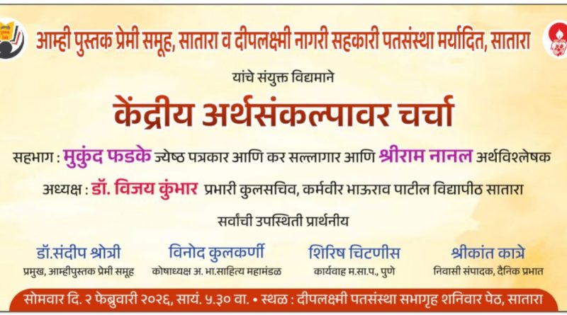 येथील दीपलक्ष्मी नागरी सहकारी पतसंस्था आणि आम्ही पुस्तक प्रेमी समूह यांच्या संयुक्त विद्यमाने सोमवार दिनांक 2 फेब्रुवारी रोजी सायंकाळी 5:30 वाजता दीपलक्ष्मी सभागृह येथे अर्थसंकल्प 2026 वर चर्चा आयोजित करण्यात आली आहे.केंद्रीय अर्थमंत्री निर्मला सीतारामन एक फेब्रुवारी रोजी संसदेमध्ये अर्थसंकल्प सादर करणार आहेत.या अर्थसंकल्पाचा अर्थ सांगणाऱ्या या कार्यक्रमामध्ये ज्येष्ठ बँकिंग तज्ञ श्रीराम नानल आणि ज्येष्ठ पत्रकार व कर सल्लागार मुकुंद फडके सहभागी होणार आहेत. या कार्यक्रमाच्या अध्यक्षस्थानी अर्थतज्ञ प्राध्यापक डॉक्टर विजय कुंभार असणार आहेत. सातारकर नागरिकांनी या कार्यक्रमाचा लाभ घ्यावा असे आवाहन डॉक्टर संदीप श्रोत्री, शिरीष चिटणीस ,विनोद कुलकर्णी, श्रीकांत कात्रे यांनी केले आहे