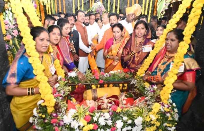 त्यानंतर मुख्यमंत्री आणि उपमुख्यमंत्र्यांनी बाल शिवाजी व माॅं जिजाऊंच्या पुतळ्यास पुष्पहार अर्पण केला. आणि छत्रपती शिवाजी महाराजांच्या प्रतिमेची पालखी वाहीली.