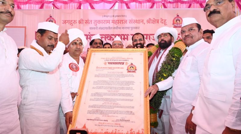 जगद्गुरु श्री तुकोबाराय त्रिशकोत्तर अमृत महोत्सवी (३७५ वा) सदेह वैकुंठगमन सोहळ्यानिमित्त देहू येथे उपमुख्यमंत्री शिंदे यांना वारकरी संप्रदायातील सर्वश्रेष्ठ जगद्गुरु श्री संत तुकाराम महाराज पुरस्कार प्रदान करण्यात आला. त्यावेळी आयोजित सोहळ्यात ते बोलत होते.