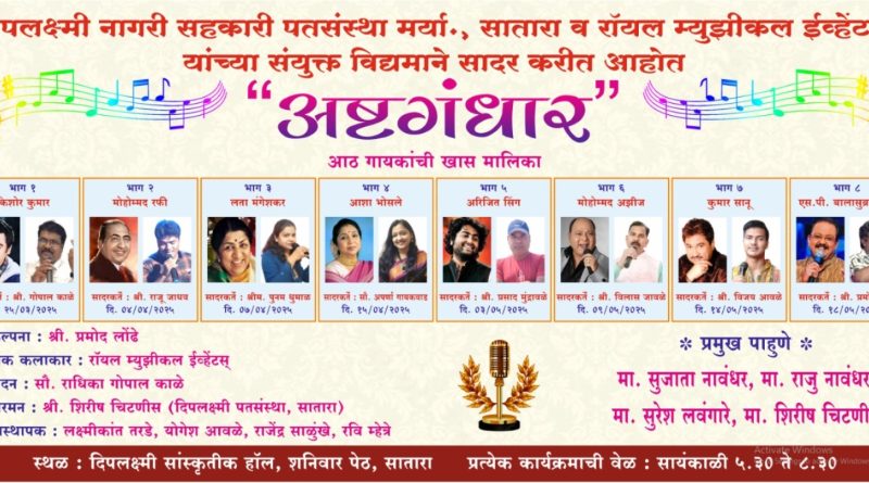 दीपलक्ष्मी नागरी सहकारी पतसंस्था आणि रॉयल म्युझिकल इव्हेंट्स ग्रुप सातारा यांच्या संयुक्त विद्यमाने आयोजित “अष्टगंधार” आठ गायकांची खास मालिका मधील भाग तिसरा हा दि. सोमवार ७ एप्रिल २०२५ रोजी सायंकाळी ५.३० ते ८.३० या वेळेत दीपलक्ष्मी सांस्कृतीक हॉल मधे आयोजित केला आहे. हा कार्यक्रम स्व. गानकोकिळा लता मंगेशकर यांच्या गाण्यांवर आधारित आहे. रॉयल म्युझिकल इव्हेंट्सच्या पूनम धुमाळ ह्या कार्यक्रम सादर करणार आहेत. कार्यक्रमासाठी प्रमुख पाहुणे म्हणून सौ. सुजाता नावंधर, श्री. राजू नावंधर, श्री. सुरेश लवंगारे, व दीपलक्ष्मीचे चेअरमन शिरीष चिटणीस हे उपस्थित राहणार आहेत. कार्यक्रमाची संकल्पना रॉयल म्युझिकल इव्हेंट्सचे श्री. प्रमोद लोंढे यांची आहे निवेदन सौ राधिका काळे यांचे आहे. पुनम धुमाळ यांचे सोबत रॉयल चे इतर गायक त्यांना साथ संगत देणार आहेत.